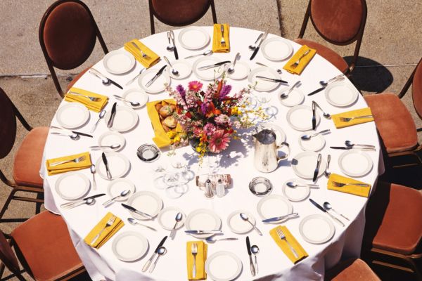 Keep at least 20 inches between each setting so guests have enough space. Always center each plate in front of its chair for a polished, balanced appearance.